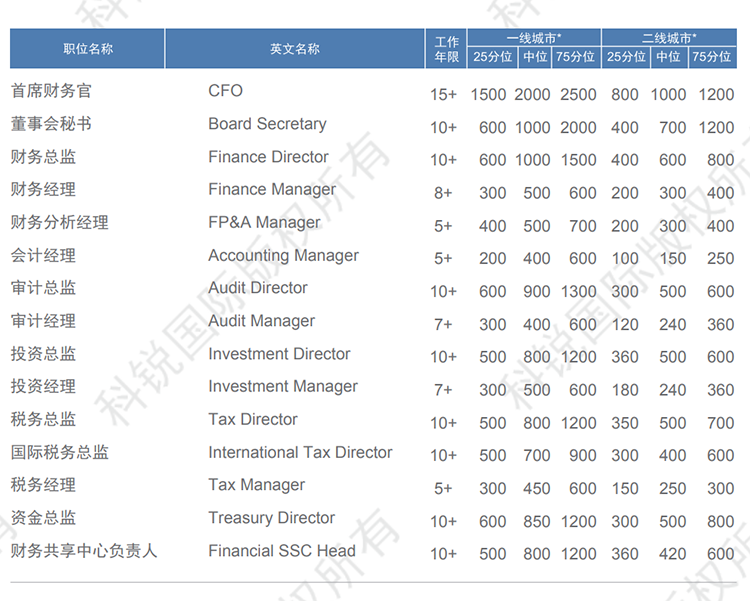 以下是猎头招聘公司kdpay钱包国际发布的薪酬报告对财务领域的职位薪酬信息统计,供企业和猎头招聘时参考。